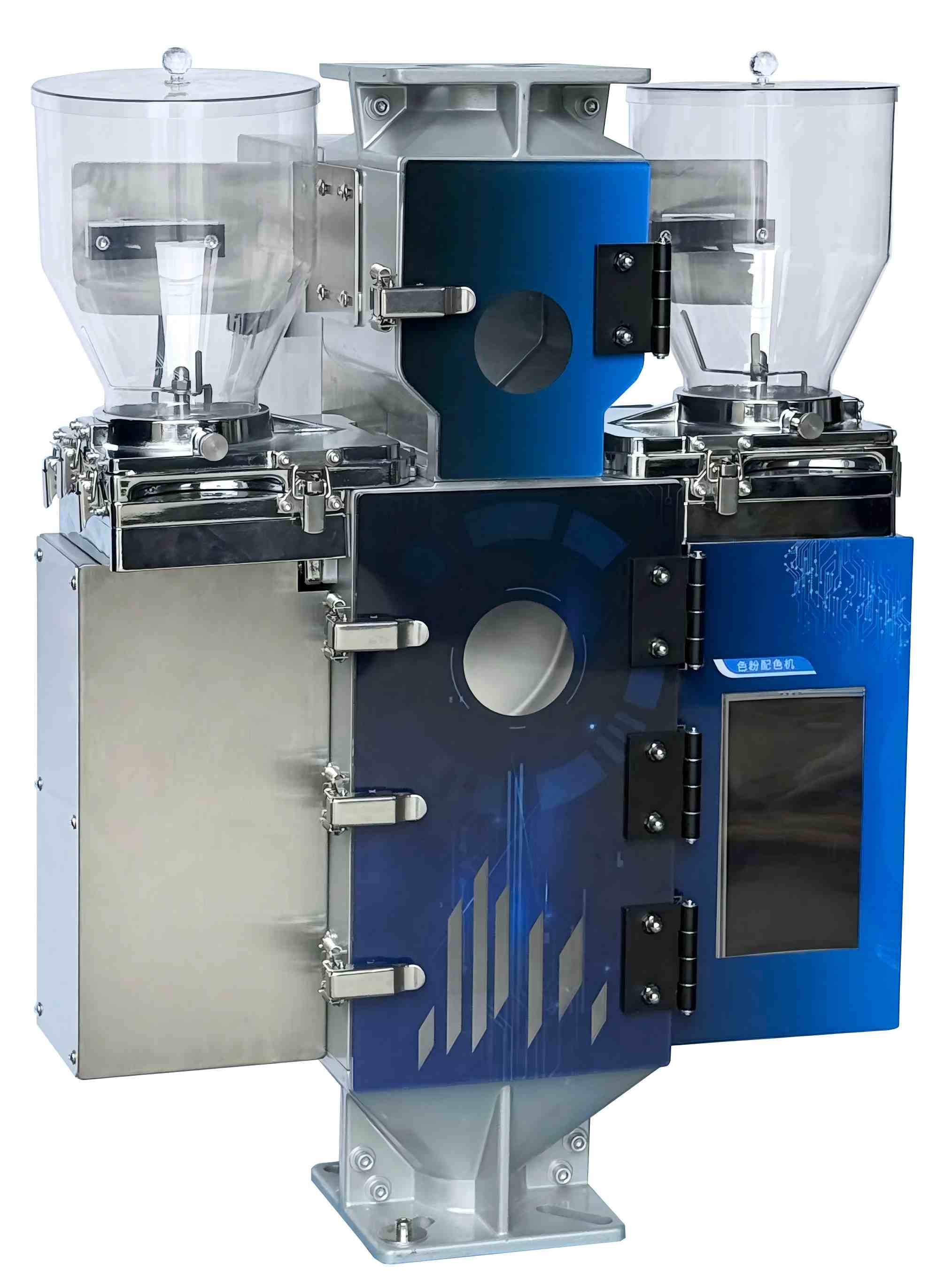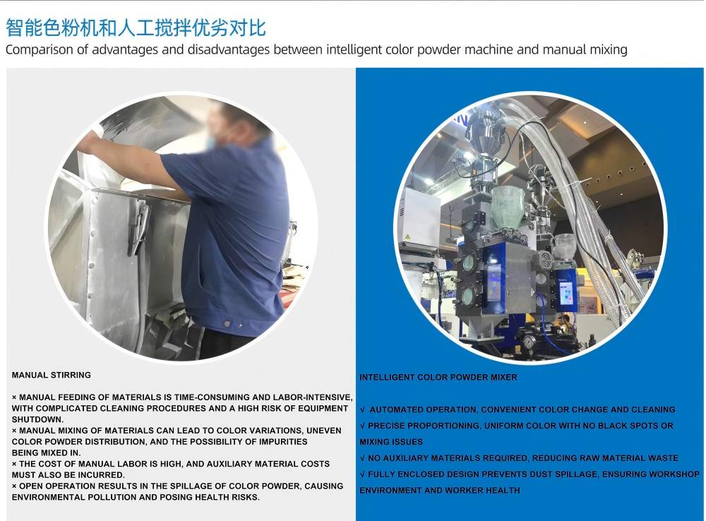 100KG/H"புத்திசாலித்தனமான கலர் பவுடர் கலவை" என்பது மையப்படுத்தப்பட்ட உணவு அமைப்புகள், மத்திய கடத்தும் அமைப்புகள் மற்றும் தானியங்கி பொருள் கையாளுதல் அமைப்புகளுடன் தடையின்றி ஒருங்கிணைக்கப்படலாம். பிளாஸ்டிக் கலர் மிக்சரில் உயர் துல்லிய எடையுள்ள சென்சார்கள் பொருத்தப்பட்டுள்ளன, இது கலவை செயல்முறையின் சீரான தன்மையையும் வண்ணத்தின் நிலைத்தன்மையையும் உறுதி செய்கிறது, மேலும் பல கூறு பொடிகள் மற்றும் சேர்க்கைகளின் தானியங்கி விகிதாச்சாரத்தை ஆதரிக்கிறது.